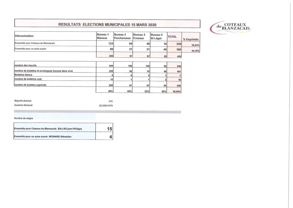 Résultats élections municipales de Coteaux-du-Blanzacais 15/03/2020